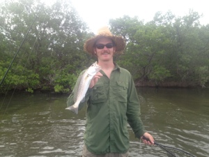 Bait was quite plentiful once we got out onto the sandy flats of the 10,000 islands area. Cast netted a nice selection of small pogies (menhaden) and continued heading west to find a spot that looked shallow enough to wade. Chose a point near the open water of the Banana River yet still protected from the southerly winds and past where a canoe fisherman had stopped to fish.
