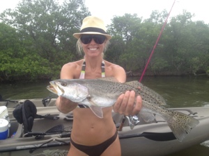 We were able to get out of the house today since the storm moved further west overnight. Loaded up the kayaks and headed over to ramp road in cocoa beach. Water was quite high and turbid from all the recent rain and wind, so expected to be catching a trash can slam. (trash can slam is catching 3 inedible fish species such as catfish, ladyfish, bluefish or jacks)