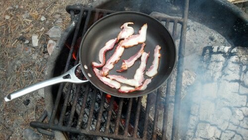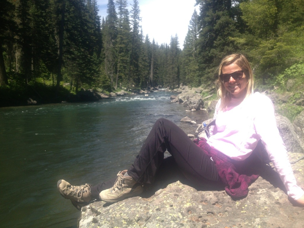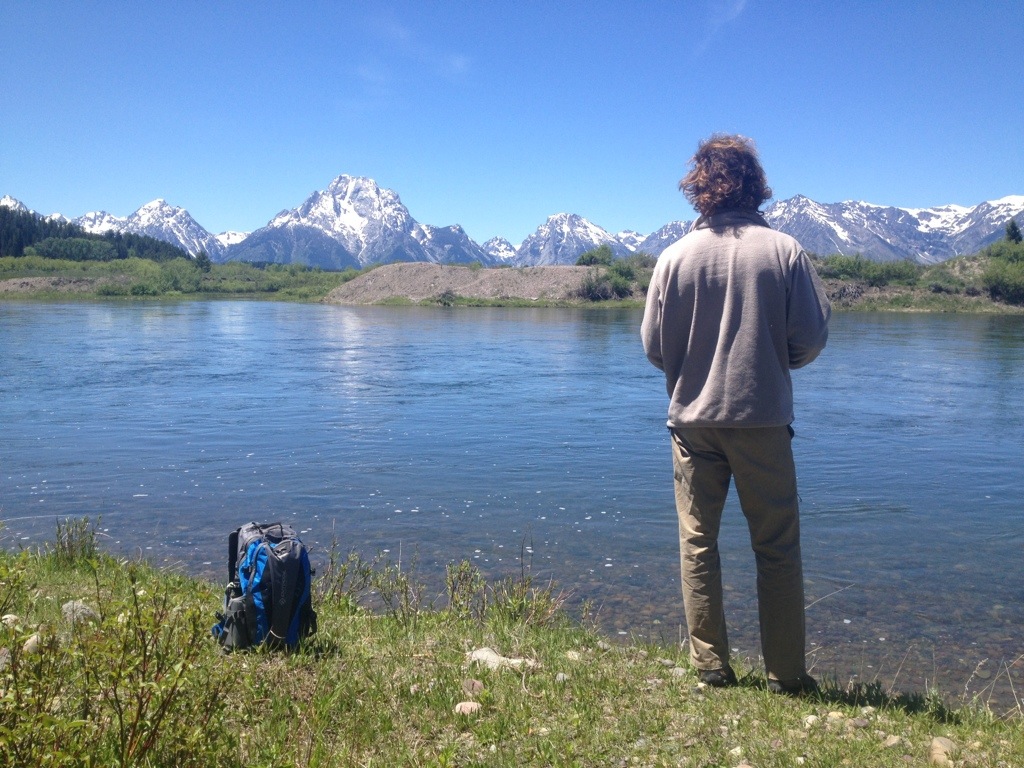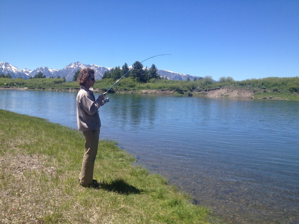 After our delicious breakfast of eggs and local bacon from a farm/meat market in Utah that we cooked over the fire, we headed off on our bikes to the Jackson Lake dam to do some fishing along the Snake River. Turned out to be a beautiful clear sunny day! Chris caught a few trout as we hiked about 3 miles along the river. We stopped at the Jackson Lake Lodge on our bike ride back to the campsite. We looked around a bit but no happy hour specials so we kept going. Ended up with about a 16 mile round trip bike ride. Once back at the campsite, we got the bonfire going and cooked up some hamburgers (purchased from the same meat market) over the fire. We’ve definitely been eating more meat out west due to the availability of more local, grassfed meat. Tasty!!