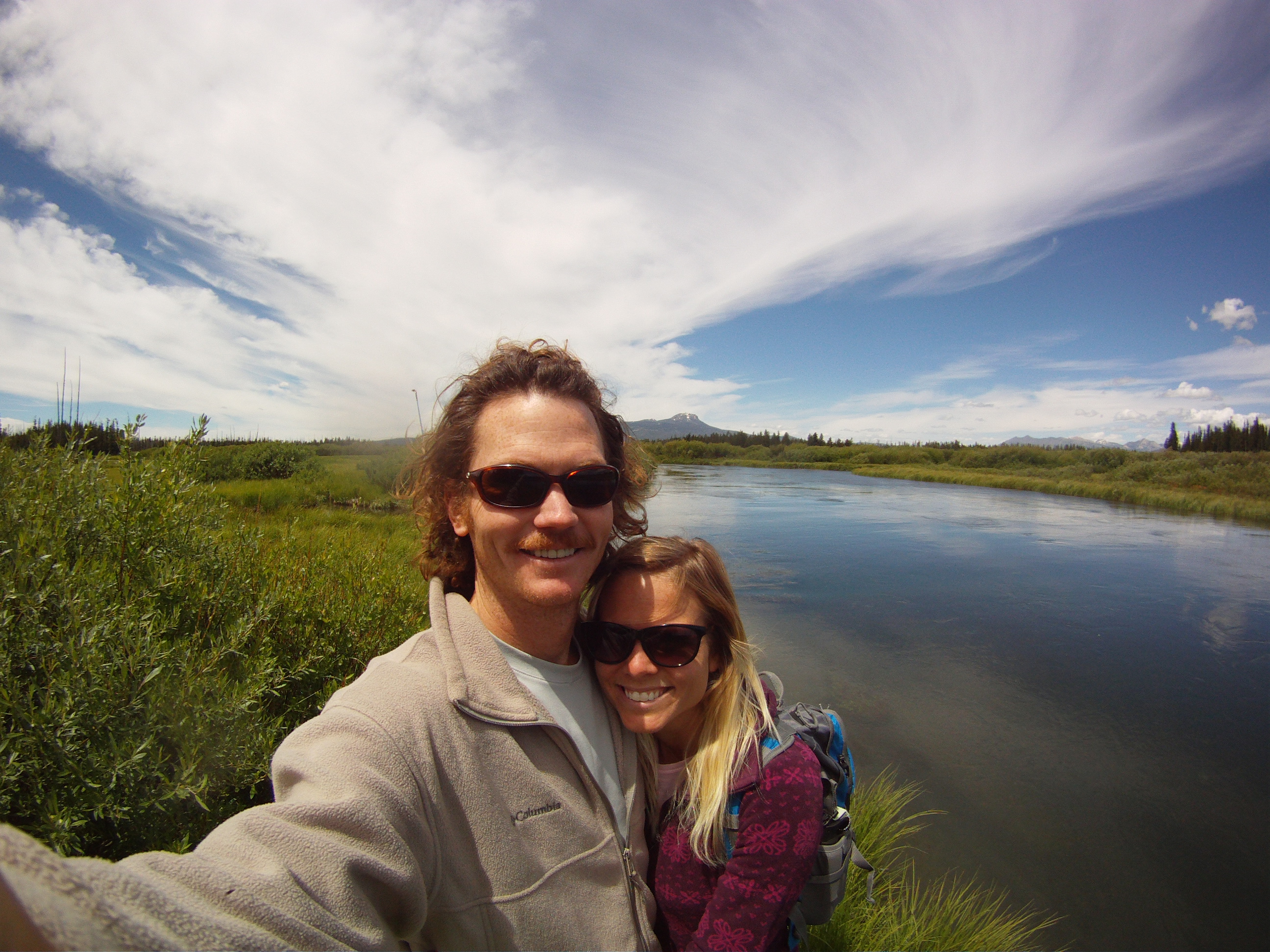 Started the morning with plans for an simple mid-day hike with some fishing near our campground. Once again, Chris’ unplanned short day hiking turned into a full length trek. A few mile upstream hike turned into a 15 miler, packed with mostly unscenic views, 8 miles of roadside shoulder walking dodging vehicles, grizzly bear tracks, a buffalo traffic jam, and a finale of sore feet and blisters. Wearing water shoes with no socks is a bad idea for that mileage amount. I have a dislike for round trips on the same trail, so always seem to find an alternate return path, regardless of the appropriateness of that option. Cindy will take over the hike planning the rest of this week, once our bodies recover…