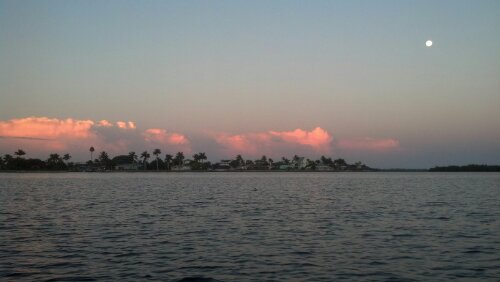 Packed up the truck on Saturday morning and set a meeting time near Miami with our friends so we could caravan down US1. Stopped at a dive shop in Key Largo for a few miscellaneous items, then enjoyed a delicious Cuban sandwich for a late lunch. Pulled into Marathon around 5pm, unloaded our gear into the house and launched the boat just before sunset. Found the house interior to be an interesting mix of 1980s appliances, nicely remodeled bathrooms and unrelated accents found from an array of flea market vendors, which is about the norm for budget priced rental homes in the Keys.